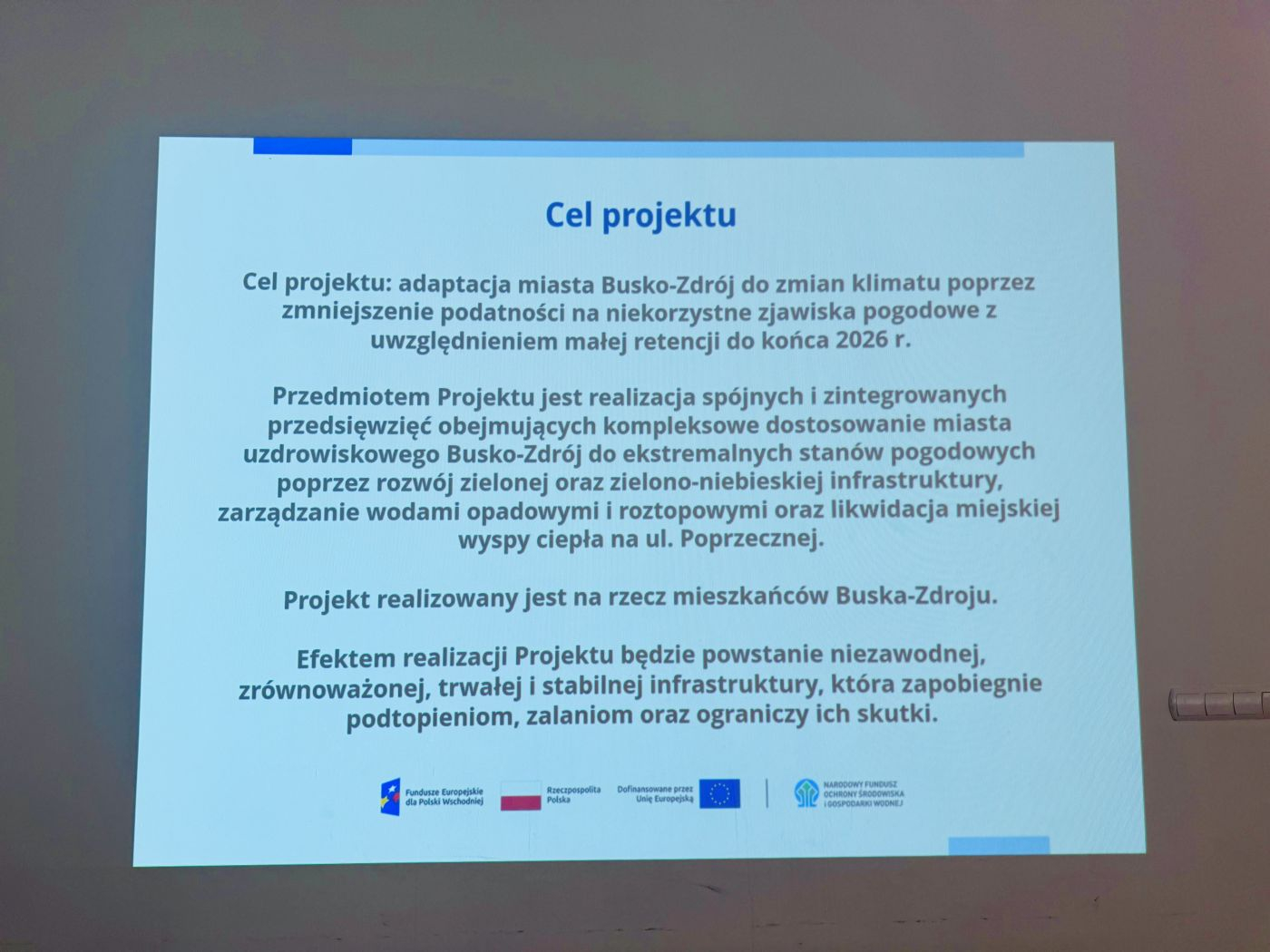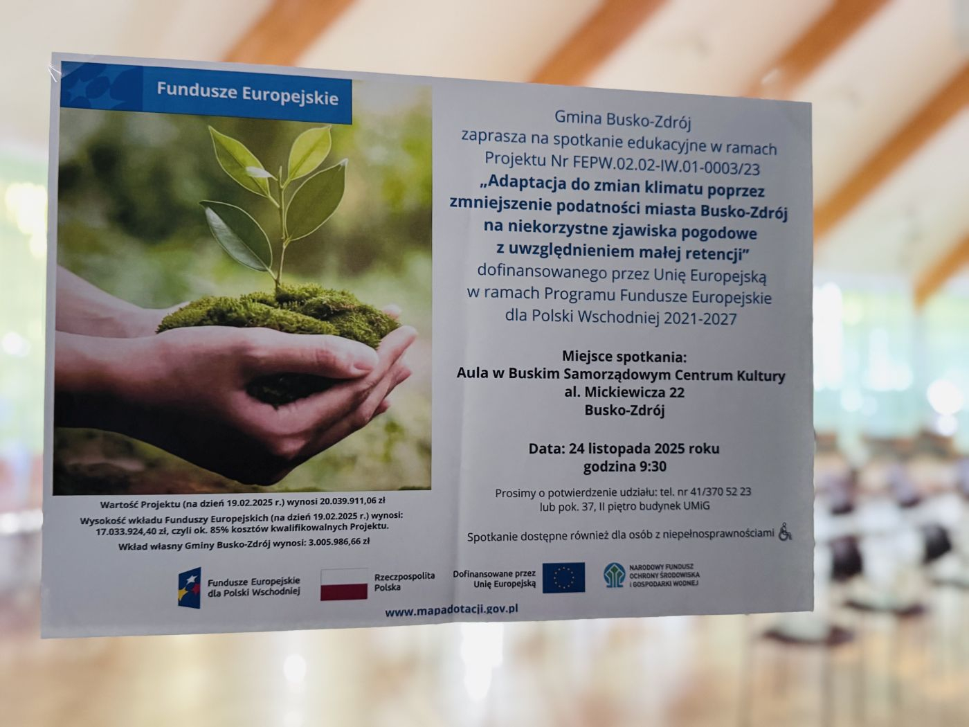W dniu 24 listopada 2025 r. w Auli Buskiego Samorządowego Centrum Kultury w Busku-Zdroju odbyło się spotkanie edukacyjne zorganizowane w ramach projektu „Adaptacja do zmian klimatu poprzez zmniejszenie podatności miasta Busko-Zdrój na niekorzystne zjawiska pogodowe z uwzględnieniem małej retencji”, współfinansowanego przez Unię Europejską w ramach Programu Fundusze Europejskie dla Polski Wschodniej 2021–2027.