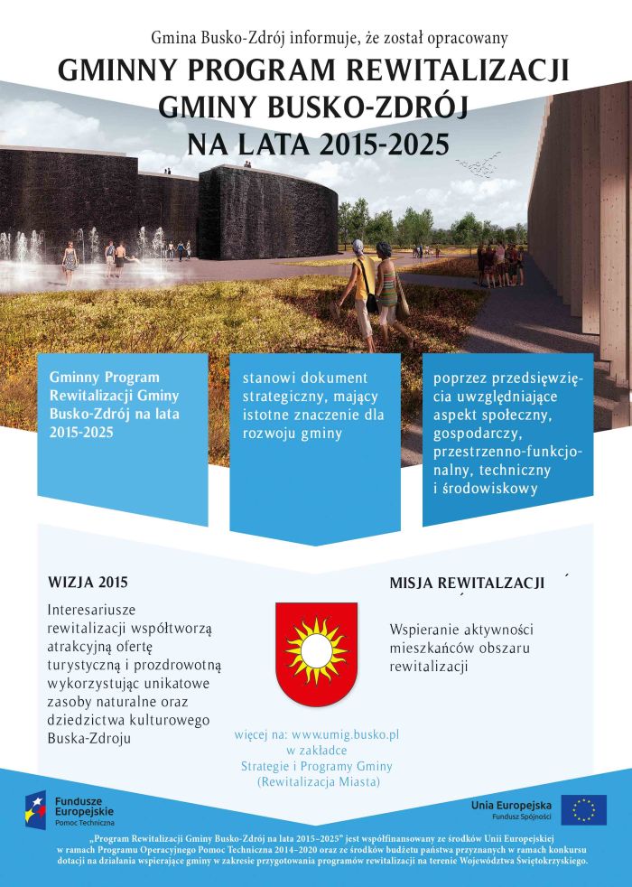 W związku z planowaną realizacją procesu rewitalizacji, Gmina Busko-Zdrój rozpoczyna działania związane z opracowaniem Gminnego Programu Rewitalizacji Gminy Busko-Zdrój na lata 2015–2025 zgodnie z Ustawą z dnia 9 października 2015 roku o rewitalizacji (Dz. U. z 2015 r. poz. 1777, z późn. zm.) oraz Wytycznymi w zakresie rewitalizacji w programach operacyjnych na lata 2014–2020 zatwierdzonymi w dniu 2 sierpnia 2016 roku przez Ministra Rozwoju.